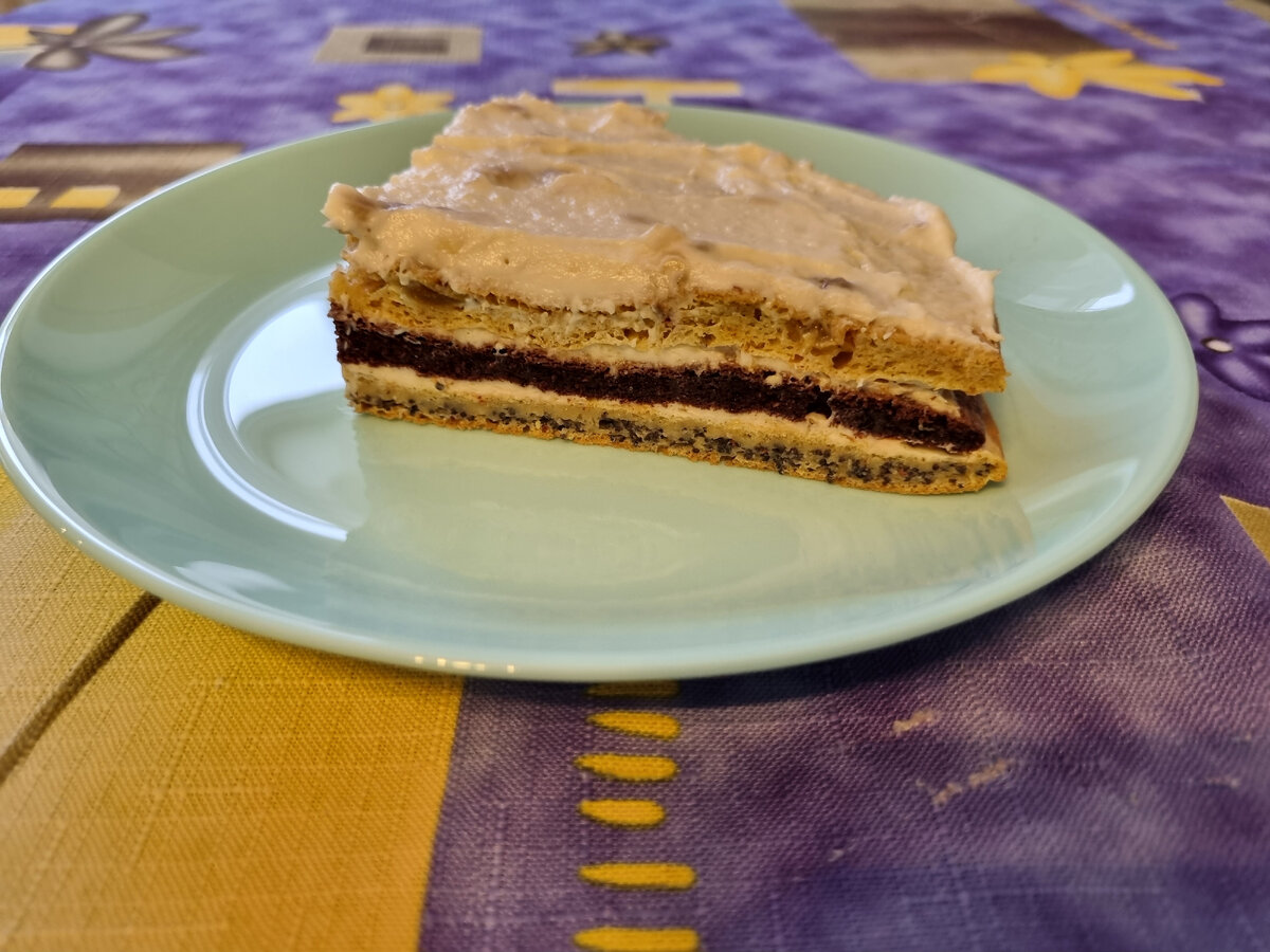 Думала я думала, чего такого десертного можно сделать из овсяноблина и придумала. Все же ели или знают торт "Министерский "? Вот я и решила сделать овсяноблин "Министерский ". За основу взяла основной рецепт овсяноблина, по которому я его делаю. Нам нужно на 1 овсяноблин: 2 ст.ложки кефира тёплого 0.5 ч.ложки соды 1 яйцо Соль, сах зам по вкусу 4 ст.ложки муки, сегодня была овсяная Я замешивала каждый овсяноблин отдельно. Намешали, добавили наполнитель, в первый овсяноблин - изюм, вот сколько нравится столько и кладёте, я полную пригоршню, заранее запаренного изюма положила. Во второй - 1 ст.ложку какао с горкой. В третий - 2 ст.ложки мака, тоже предварительно замоченного в холодной воде. Выпекаем три овсяноблина, параллельно делаем крем. Крем у нас делается из баночки рикотты и 1 банана. Банан разминается вилкой, добавляется рикотта и все хорошенько перемешивается. Блинам даем немного остыть и собирает наш овсяноблинный тортик, промазывая хорошо кремом. Даём постоять, пропитаться