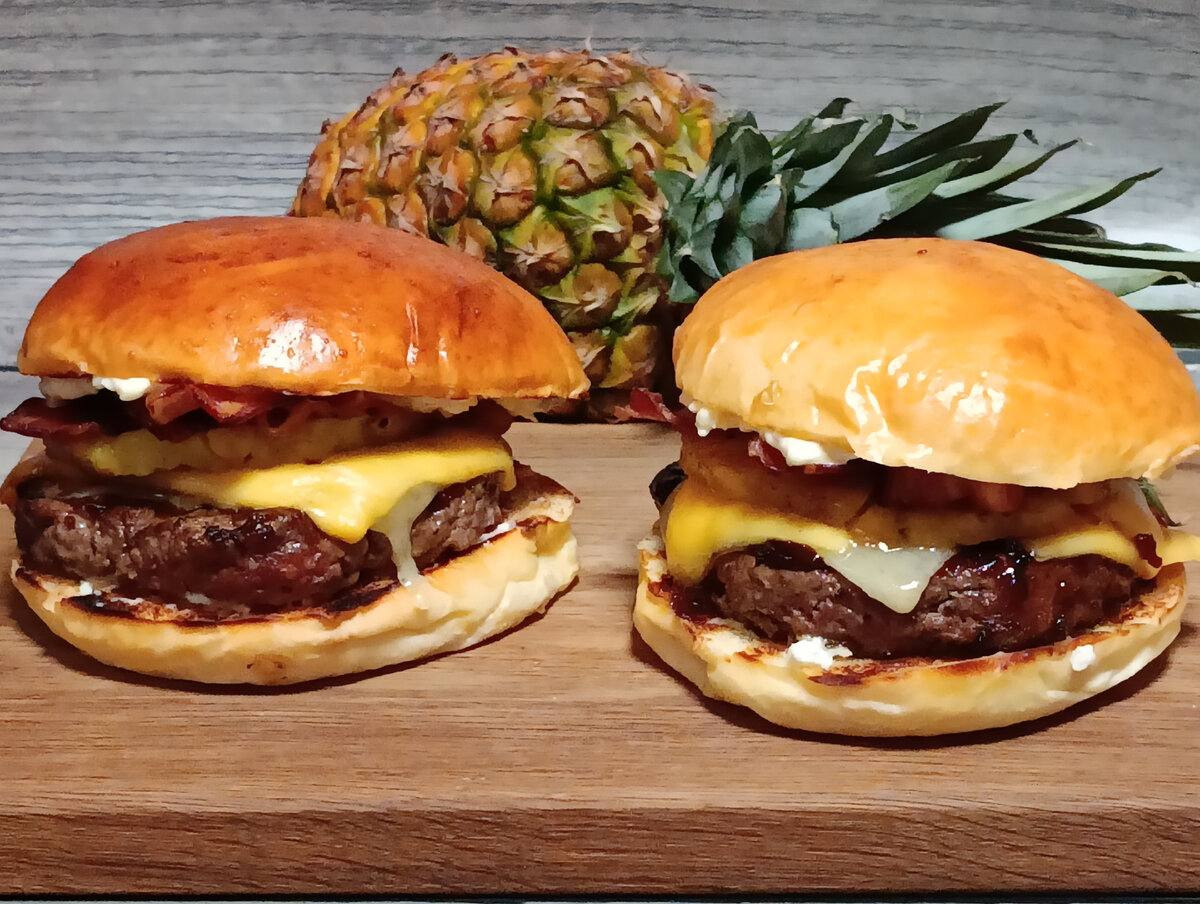 Бургер с говяжьей котлетой и расплавленным чеддером, приготовленной по японской технике "терияки", с интересным соусом "пина колада", у которого ярко выраженный кокосовый вкус с нотками свежего ананаса. Для большей аутентичности используем булочки с ананасовым соком. Придадим еще больше ананасового вкуса- пожарим на гриле кольца свежего ананаса и немного копченых ноток - запеченный бекон. булочки для бургеров (ямайских или гавайских) - 3 шт.