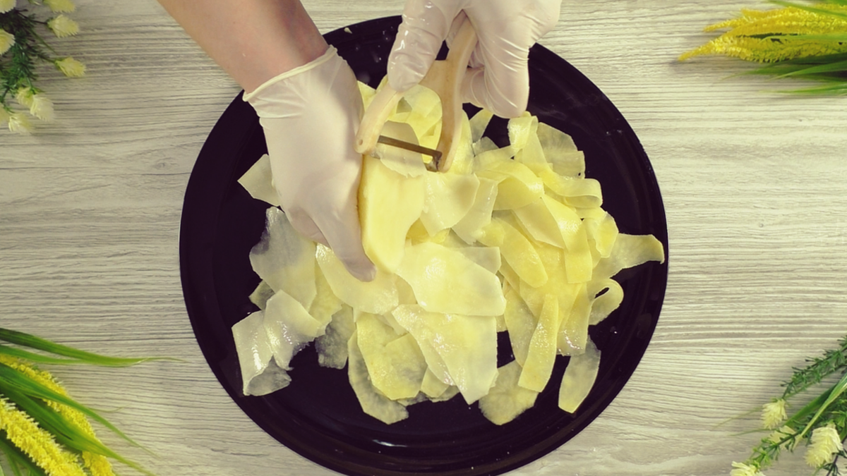 Наша задача нарезать картофель на очень тонкие пластинки.