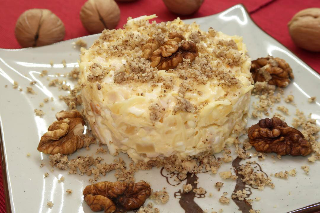 Нежное копчёное куриное филе, сладость консервированного ананаса и сытность сыра отлично оттеняет пикантная заправка из майонеза и чеснока. А если добавить горсть грецких орехов, то получается весьма оригинальное и необычайно вкусное сочетание. Этот салат идеален, как закуска к шампанскому. Для тех, кто любит краткие рецепты Ингредиенты: Куриная грудка копченая – 350 г Сыр твердый – 170 г Яйцо куриное (отварное) – 3 шт. Чеснок – 2 зубчика Консервированные ананасы – 5 колечек Грецкие орехи – одна горсть Майонез – по вкусу 1. Копчёную грудку нарезаем на небольшие кусочки. 2. Так же поступаем с консервированными ананасами. 3. Отварные яйца натираем на крупной тёрке. 4. Сыр натираем на средней тёрке. 5. Так же поступаем с двумя зубчиками чеснока. 6. Грецкие орехи измельчаем в блендере. 7. В глубокой чашке соединяем все ингредиенты: копчёную грудку, сыр, ананасы, яйца, чеснок. 8. Добавляем майонез и перемешиваем. 9. Выкладываем салат в красивую посуду или порционную форму и посыпаем грецким