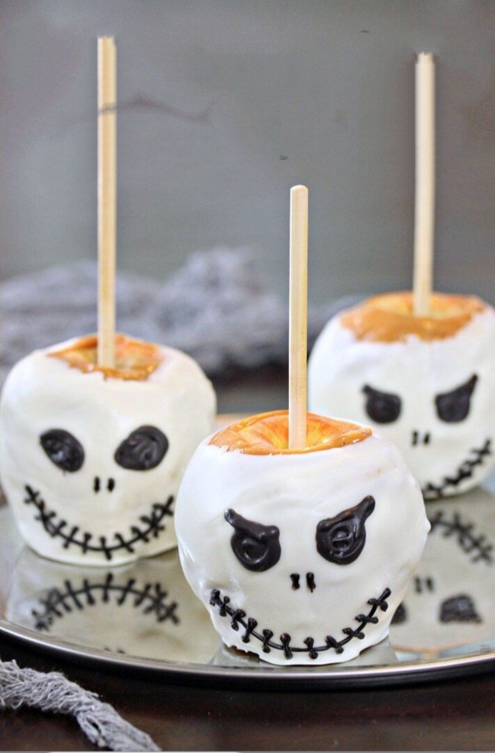 Ингредиенты: - 4 больших яблока - 270 г карамельных конфет - 1 столовая ложка масла - Палочки для шашлыков - Шоколадные капли или шоколадная глазурь для декора - Белая шоколадная глазурь или глазной шарик для глаз 1. Покройте противень или тарелку пергаментной бумагой, чтобы яблоки не прилипали. 2. Распакуйте карамельные конфеты и поместите их в кастрюлю вместе с маслом. Разогревайте их на среднем огне, постоянно помешивая, пока конфеты полностью не растопятся и образуют гладкую карамельную массу. 3.Погрузите каждое яблоко в карамельную массу, переворачивая его, чтобы полностью покрыть яблоко карамелью. Позвольте лишней карамели стекать с яблока обратно в кастрюлю. Поставьте карамелизованные яблоки на преготовленный противень или тарелку и дайте им полностью остыть. 4. Декорируйте черепа: используя шоколадные капли или шоколадную глазурь, разместите их на месте глаз черепа. Для зубов, можно использовать разбитые кусочки белого шоколада или глазные шарики, вставив их вниз карамельного