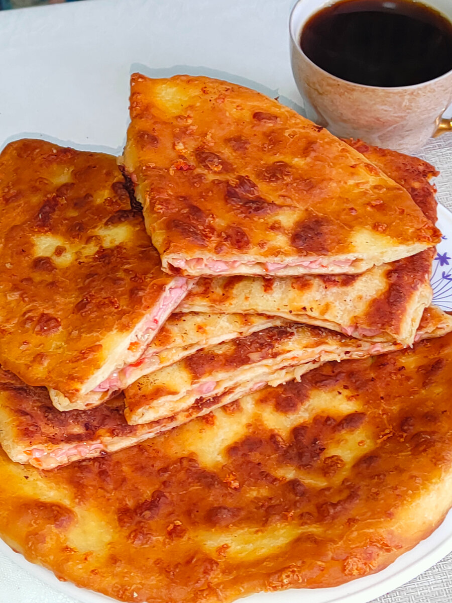 Мука — 2 стакана. В кефир добавляем соль, сахар и соду. Хорошо перемешиваем. Затем добавляем натертый сыр и тоже перемешиваем. Потом начинаем добавлять муку и замешиваем тесто. В этот раз натёрла чуть больше сыра и что бы сразу его использовать добавила его к натёртой колбасе, а также натёрла один болгарский перец( вот прям захотелось) и всё перемешала. Вот такая сегодня у меня получилась начинка) Не забывайте про 👍 и подписку 🧡. Для автора это очень важно 💥 Готовое тесто я разделила на 4 части, но можно и на большее кол-во, если хотите, что бы лепёшки бы