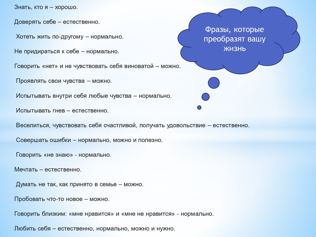 В ритме современной жизни у людей совсем не остается времени восполнить свои энергетические ресурсы, поддержать свою мотивацию и трудоспособность. Порой, мы несёмся в этом ритме, продиктованным жизнью, не замечая, как растрачиваем свои ресурсы направо и налево. Но.. может так случится, что в один момент нас перестаёт радовать то, что прежде радовало, мы не получаем удовольствие от тех вещей, которые раньше были нам приятны. И мы начинаем копаться в себе, искать ошибки и "разбирать себя по косточкам" стараясь найти причину, что привела к такому состоянию. И всё больше исследований и долгосрочных наблюдений приводят к выводу о том, что забота о себе- это не эгоизм, и не что то, чем надо пренебрегать. А ещё очень важно- ПОЗИТИВНОЕ МЫШЛЕНИЕ. Позитивное мышление и лучезарная улыбка - атрибут почти всех успешных людей. Одной из форм позитивного мышления являются позитивные убеждения или аффирмации. Фраз, которые помогут нам оставаться в ресурсном состоянии, превеликое множество, но кода он