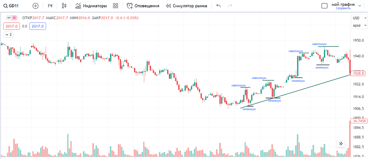 Торгуй по тренду - эту фразу, наверное слышит каждый новичок в числе самых первых, при знакомстве с трейдингом. Ну во всяком случае у меня было именно так, в умных книгах по техническому анализу было написано, что самая простая и самая выигрышная стратегия - это торговля по тренду. Давайте разберемся, что представляет из себя тренд, и как его использовать. А в конце статьи я приведу пример очень простой и эффективной стратегии торговли трендов. Но прежде заострим внимание, что тренд имеет три направления - восходящий, нисходящий или горизонтальный, или иначе его называют боковик или флэт. В своем примере я буду рассматривать восходящий тренд. Итак, что же такое тренд? Это серия последовательно повышающихся минимумов и максимумов, когда каждый следующий минимум и максимум выше предыдущего. Для того, чтобы провести линию тренда, и таким образом определить его направление нам достаточно 2-х точек, восходящий тренд мы проводим через минимумы, нисходящий наоборот, через максимумы, но если