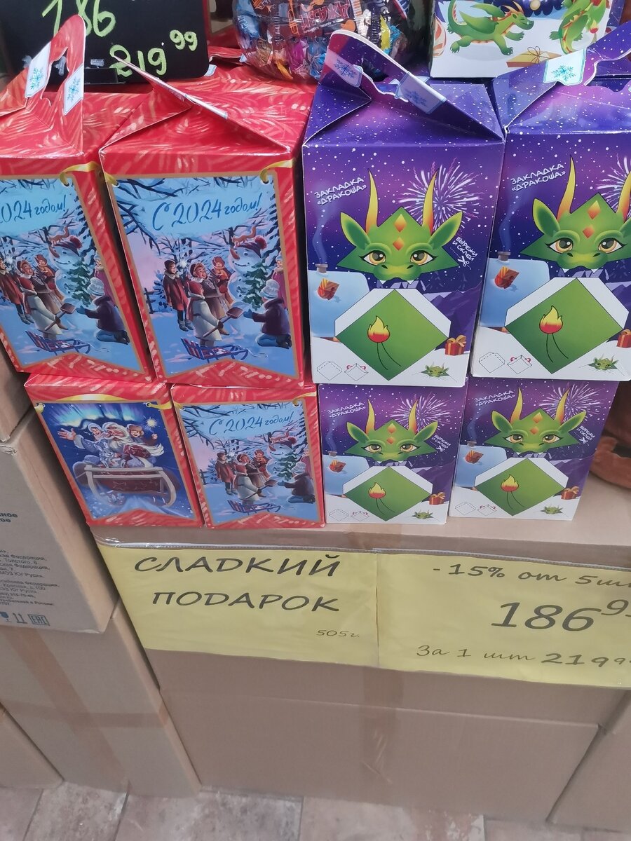 Это отличная возможность приобрести сразу большое количество подарков, если, например, они нужны для школы, детских садов и т.д. В самом магазине есть отдельная коробка, где показаны все входящие в состав сладости, но я ничего не изучала заранее, захотелось сохранить это настроение в ожидании сюрприза.