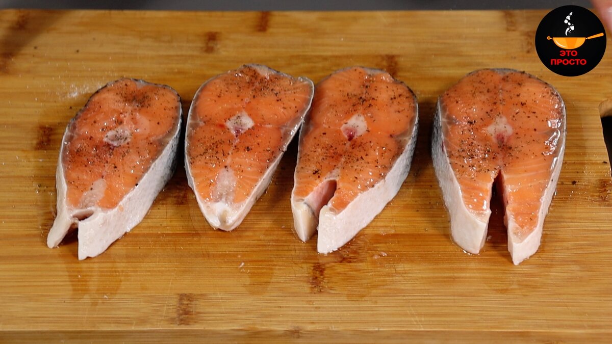 Давайте подготовим ингредиенты и уже после, поэтапно, будем всё готовить. Рыбные стейки солим и перчим с двух сторон, слегка сбрызгиваем растительным маслом.