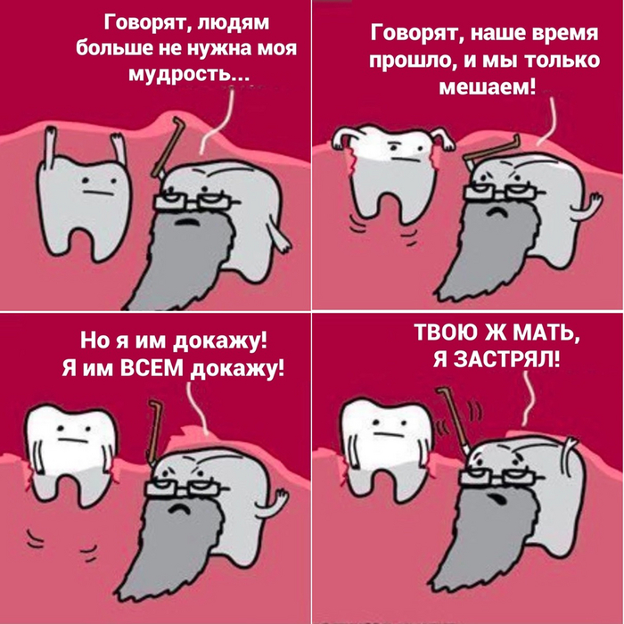 Если вообще забить болт, то начинается ретромолярный периостит(воспаление надкостницы, или, как вы любите, флюс), при которым рот перестает открываться практически совсем, усиливается боль при глотании, температура уже до 39 и появляется риск развития абсцессов клетчаточных пространств, а это уже больничка. Поэтому, штука серьезная, лучше не надеяться на «ПАПАЛАЩУСАМОПРАЙДЕТ», а сходить к стоматологу, как минимум, показаться. К слову, именно осложнения гнойных процессов, связанных с нижними зубами мудрости с огромным отрывом лидируют по смертности среди всех стоматологических осложнений, так как рядом с этой областью очень близко находится дно полости рта, а ниже клетчаточные пространства шеи, а по ним инфекция очень быстро доберется до средостения, пространства между легкими, где у тебя сердце, а дальше…. ну ты понял.