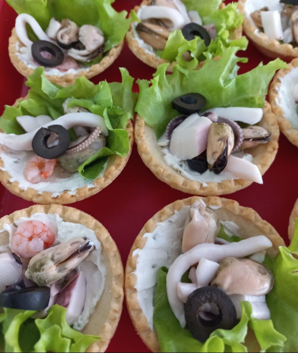 Используем : готовые валованы или песочные корзинки, творожный сыр, зелень, морепродукты, оливки,маслины,лимон. Все продукты подготавливаем и начинаем укладывать. В песочные корзинки через кондитерский мешок отсаживаем творожный сыр с зеленью, кладем морепродукты ,украшаем лимоном , оливками или маслинами.