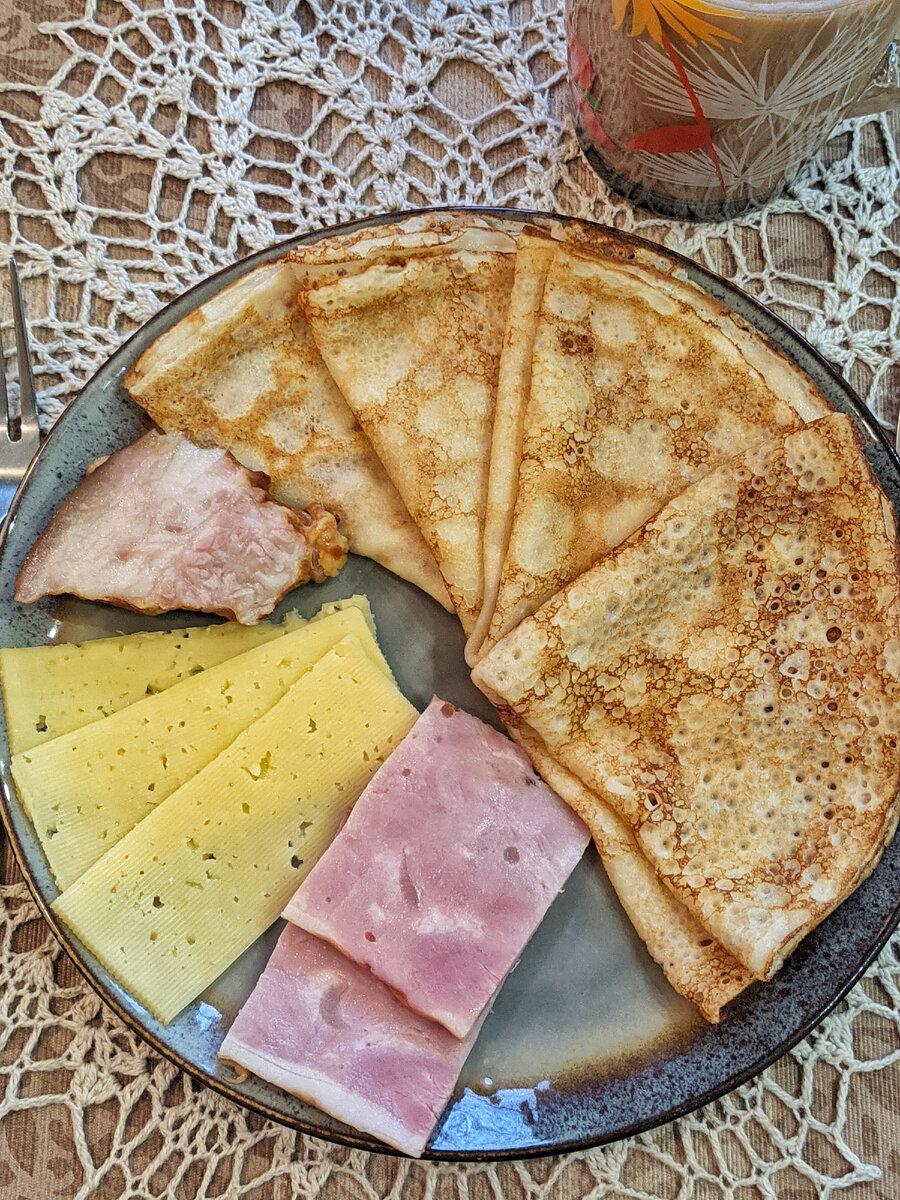 1. Питание Завтрак: - блины - окорок - щековина - сыр - сметана - витамины - кофе Вчера, когда составляла меню, так размечталась, что сегодня уже блинов захотелось. А что? Сегодня же воскресенье 😅. Сметана и витамины в кадр не вошли, но они там были 🤭. Обед: Так как ревизия в холодильнике выявила неизвестно откуда взявшееся тесто, то я решила вкуснятины приготовить. Решила и приготовила 💪. - хачапури по-аджарски - винегрет (он по-моему, никогда не закончится 😆 - мать его ударную порцию нарезала) - кефир А начинкой для хачапури немного поэкспериментировала - взяла сулугуни, мацони и белок. Вкусно получилось 😋. Полдник: - хлеб с маслом и творожной массой с курагой - вишнёвое лукошко - сыр - конфетка - чай 2. О красоте ЕК- Свадьба ещё больше распустилась 😍. В комнате дочери, которую я теперь используется, как творческую мастерскую, повесила любимые занавески - покупали, когда дочке лет 5 было 😅. А что весёленькие такие - творческие 😁. Новогодняя вышивка близится к завершению
