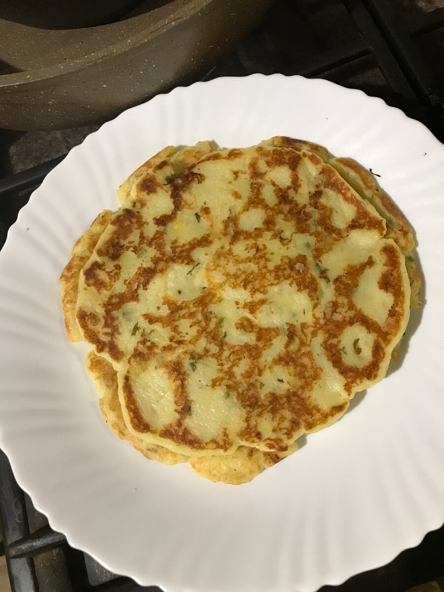 Не знаете куда деть кабачки? Надоела пустая картошка? Новый вкус привычному в этом рецепте. Понадобятся в равных частях картофель и кабачки. Очищаем овощи. Отвариваем картофель в подсоленой воде. По готовности слить воду и сделать пюре привычным способом. Я оставляю немного воды и добавляю растопленное в микроволновой печи молоко со сливочным маслом. Кабачки, тем временем, натереть на крупной терке, посолить и отжать воду, переложить на тефлоновый коврик или силиконовый с бортиком. Выпекать в разогретой духовке на 180 градусах. Кабачки должны быть готовые, не сильно румяные. Остудить и смешать вместе с пюре. Добавить специи по вкусу. Натертый на крупной терке сыр, по вкусу, подойдут практически любые сыры, кроме мягких. Можно добавить зелень. Ввести немного рисовой муки, масса должна остыть, пару яиц. Сформировать шарики руками, обжаривать на хорошо прогретой сковороде на подсолнечном масле. Для лепешек, ложкой зачерпнуть тесто и руками размять до нужного диам