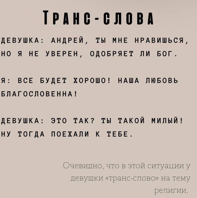 Да, снова будем их гипнотизировать😉 Сегодня на очереди такая вещь, как «трансовые слова». Это слова, которые человек повторяет, или на которых акцентирует внимание (осознанно или нет — не суть). Такое внимание к этим словам говорит о том, что они имеют для него какое-то особое значение. И вот такие вот слова (или даже темы) нужно искать в речи девушки. Их можно использовать для того, чтобы создать доверие между вами — ведь это показатель того, что ты её слушаешь и понимаешь. Это очень мощная штука, которая сильно движет чувствами людей. На картинке вам утрированный пример для понимания👇🏻 И вот как раз из-за такого индивидуального подхода транс-слова хороши для создания «особой связи». Девушка начнёт выделять тебя среди других парней и будет говорить подружкам «вы не понимаете, он особенный!» Кстати, простой, но эффективный пример транс-слова — это имя девушки;)