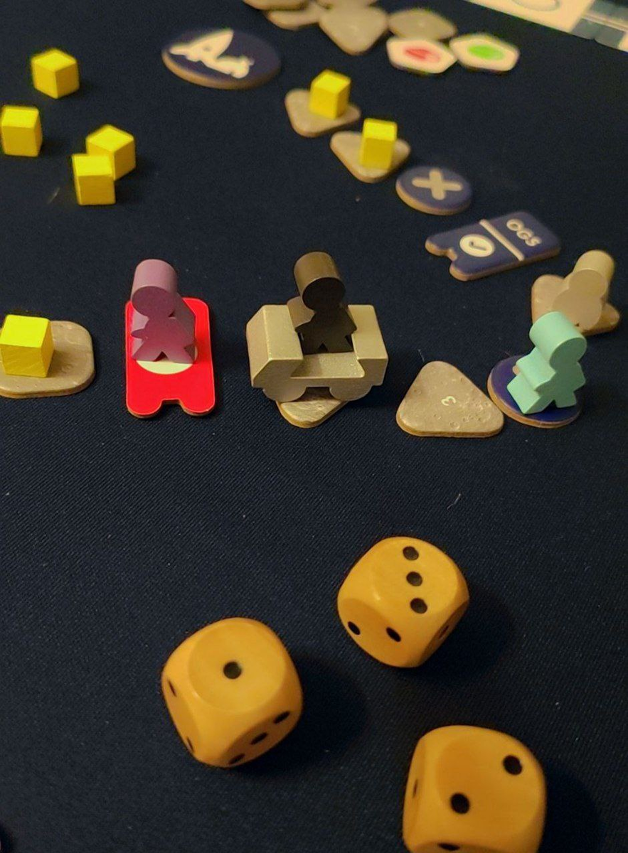 В свой ход вы должны решить, сколько кислорода потратить, затем бросить кубик и, наконец, выбрать, как потратить эти очки действия и в каком порядке. Путешествие по трассе является наиболее очевидным, но и тут стоит хорошо подумать, потому что, если вы хотите путешествовать быстрее, вам нужно перепрыгивать через своих товарищей или через уже Освоенные пространства. Таким образом, один из вас, вероятно, пойдет вперед и разместит кубики на плитках, чтобы дать возможность другим игрокам перепрыгивать через них бесплатною Однако это также означает, что эти плитки больше нельзя подобрать, что делает недоступными эти ресурсы..