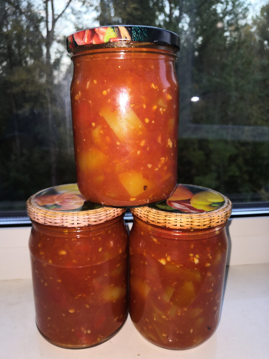 Состав : помидоры 7 кг перец болгарский 6 кг (очищенный) чеснок 300 гр горький перец 2-3 шт сахар 2 стакана (по 250 мл) соль 3 ст. л. гвоздика 4 шт душистый перец горошек 5 шт черный перец горошек 10 шт растительное масло 1 стакан ( 250 мл ) уксус 50 мл Приготовление : Помидоры, перец горький , чеснок перекрутить на мясорубке. Добавить все специи, соль , сахар, масло. Поставить на огонь. После закипания проварить 10-15 минут. Добавить в кастрюлю перец болгарский , нарезанный на квадратики или полоски (как вам удобно). После закипания варить 15-20 мин. Добавить уксус, перемешать. Разложить по банкам . Закатать. Приятного аппетита.