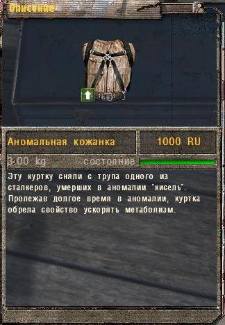 Привет! Сделай эту ссылку фиолетовой: ПОДПИСКА НА КАНАЛ Сделал? Отлично. Как мы знаем, в ТЧ нет возможности модифицировать броню, а починка реализована только как баг и не так, как должна была бы (все-таки аномалии не должны чинить броню, хотя это же аномалии - чего с них взять), зато мы можем найти УЖЕ усовершенствованные костюмы... Аномальная кожанка Видимо, эта куртка когда-то принадлежала сталкеру-новичку. Учитывая, что она "аномальная", судьба сталкера, увы, вряд ли оказалась с хэппи-эндом. Найти эту весьма занятную вещицу можно на Кордоне, в тайнике "Газовая труба". По сути, это кожаная куртка, но не простая, а аномальная. Она увеличивает выносливость владельца, увеличивает его восстановление здоровья и заживляет раны, НО это правда лишь отчасти. Да, тут снова баг: игра просто не считывает показатели регенерации здоровья и ликвидации кровотечений у брони, так что от обычной такая кожанка отличается лишь увеличением выносливости хозяина. Ну и соответственно, никакого смысла в том,