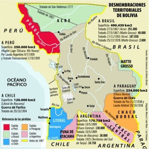Территориальная эволюция Боливии - это история потерь и поражений. Как видно на этой карте, боливийскую земелюшку успешно оттяпывали все соседи, а Чили лишила эту страну выхода к морю.
