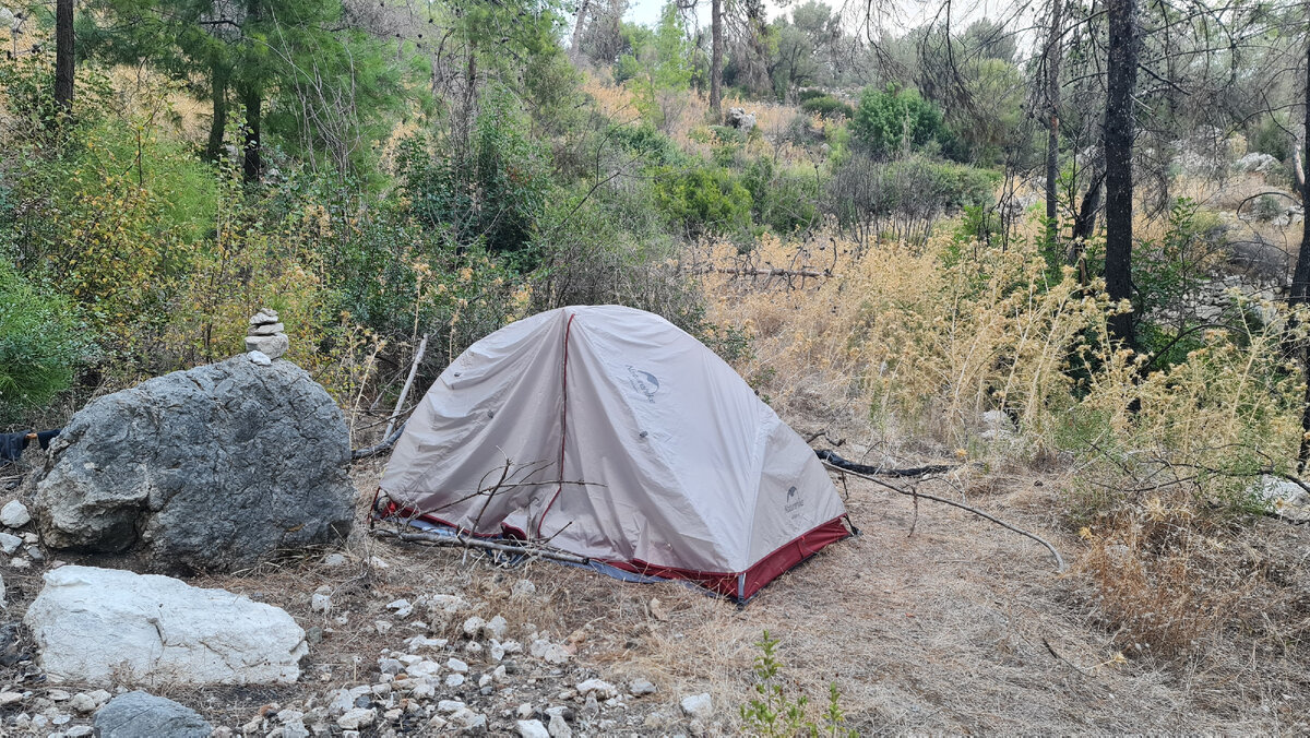 Пока мы пытались уснуть и не сваливаться друг на друга, внизу на берегу началась дискотека. Это не помешало Арсению таки погрузиться в сон, а меня усталость не брала. И вдруг знакомый рык. Кабан. Он был метрах в пяти от палатки, со стороны головы. Ночь была жаркая и спальниками мы лишь слегка укрывались. Я тихо села, положила руки на Арсения, чтобы не шевелился. Кабан ходил вокруг палатки. Еда была в мешках хорошо упакована в рюкзаке, который лежал между камнем и палаткой чтобы она не скатывалась. Зверь спускался вниз по склону и снова поднимался. Вечернее пати внизу его не смущало. Минут через 20 все стихло. Я попыталась уснуть. Полная луна освещала нашу поляну. Сон был урывками, камни впивались в бока, угол наклона давал о себе знать... В общем, я ждала утра. В 7:00 закапал дождь. Собрала вещи с улицы, занесла в палатку. По прогнозу только облачность. К 8 просветлело. Позавтракали, упаковались. В 10 вышли. Вместо тропы пошли по дороге. Не нашли на неё вход, тк здесь убирают деревья