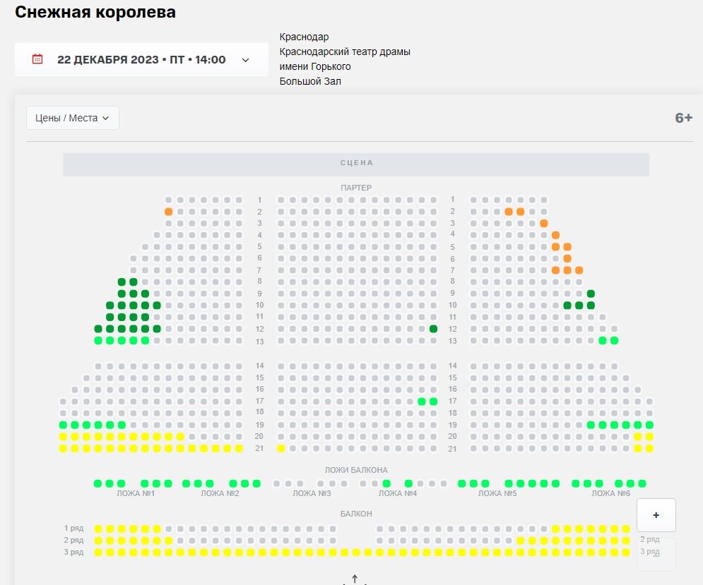 В Краснодаре к 30 октября во многих театрах, несмотря на середину осени, уже раскупили билеты на детские новогодние спектакли. Мест осталось очень мало, а на какие-то представления их уже и вовсе нет. 6+ «Думаю, посмотрю билеты на новогодние представления для ребёнка в декабре, что вообще идёт в городе, афишу. А билетов-то уже почти и нет. Еще ведь только октябрь! Вы когда их разбираете, летом что ли?», - задаётся вопросом читательница «Блокнота Краснодара». Театр драмы Например, в театре драмы имени Горького для детей перед Новым годом покажут такие постановки, как «Конёк-Горбунок», «Буратино» и «Снежная королева». «Блокнот Краснодара» выборочно проверил наличие билетов. Так, на «Снежную королеву» в пятницу, 22 декабря днём почти все билеты в партере распроданы. Да и центр балкона тоже. На тот же спектакль на 24 декабря мест еще меньше. С "Коньком-Горбунком" и "Буратино" ситуация лучше. Здесь еще есть, из чего выбрать. "Конёк-Горбунок" "Буратино" Театр кукол В Краснодарском краевом те