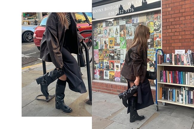 3 стильные идеи от фэшн-инфлюенсеров Байкерские ботинки — настоящий маст-хэв этой осени. Они удобные, стильные и главное — универсальные. Такую обувь можно абсолютно по-разному внедрить в свой гардероб. Уйти в полный гранж, добавить романтики или «офискора» — выбирайте вариант на свой вкус. Несколько стильных комбинаций на эту осень ищите ниже Байкерская куртка + юбка макси «Сочетание несочетаемого» — главный секрет в создании стильного образа. Грубые ботинки рекомендуем комбинировать с романтичными юбками и блузами, а сверху надевать кожаную куртку-косуху или теплую дубленку. С одной стороны аутфит получится нежным и женственным, а с другой — дерзким и грубым. Вариант стилизации предлагаем ниже. Джемпер + пальто Самое важное осенью — уют, поэтому не забываем про трикотажные вещи. Например, с biker boots можно надеть темплый вязаный свитер, который точно не даст вам замерзнуть в холодную погоду. Многие инфлюенсеры комбинируют джемпер с шортами, но в нашем суровом климате больше подой