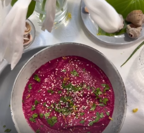 консервированный нут с вареной свеклой взбиваем в блендере на максимальной скорости. Добавляем половину зубчика чеснока и 2 столовые ложки кунжута, столовую ложку оливкового масла, лимонный сок, соль.
