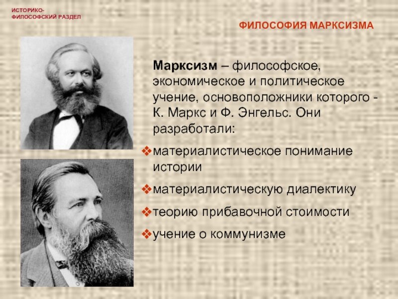 Марксистское понимание истории и исторического процесса основано на работе Карла Маркса и Фридриха Энгельса. Они разработали теорию исторического материализма, которая утверждает, что история по существу определяется материальными условиями производства и классовой борьбой.