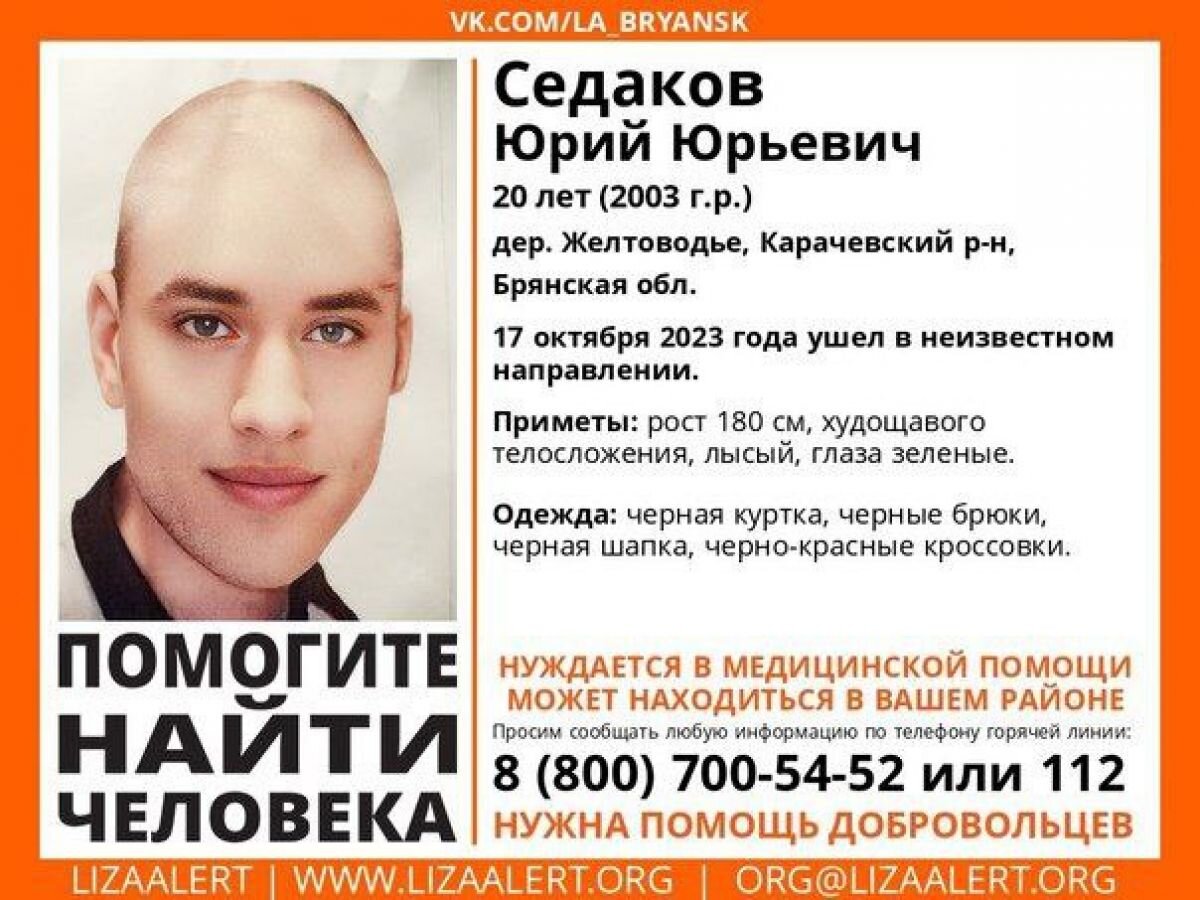 В Брянской области разыскивают 20-летнего Юрия Седакова. Как сообщили поисковики брянского отряда «Лиза Алерт», молодой человек ушел из своего дома в деревне Желтоводье Карачевского района 17 октября. На данный момент его местонахождение неизвестно.