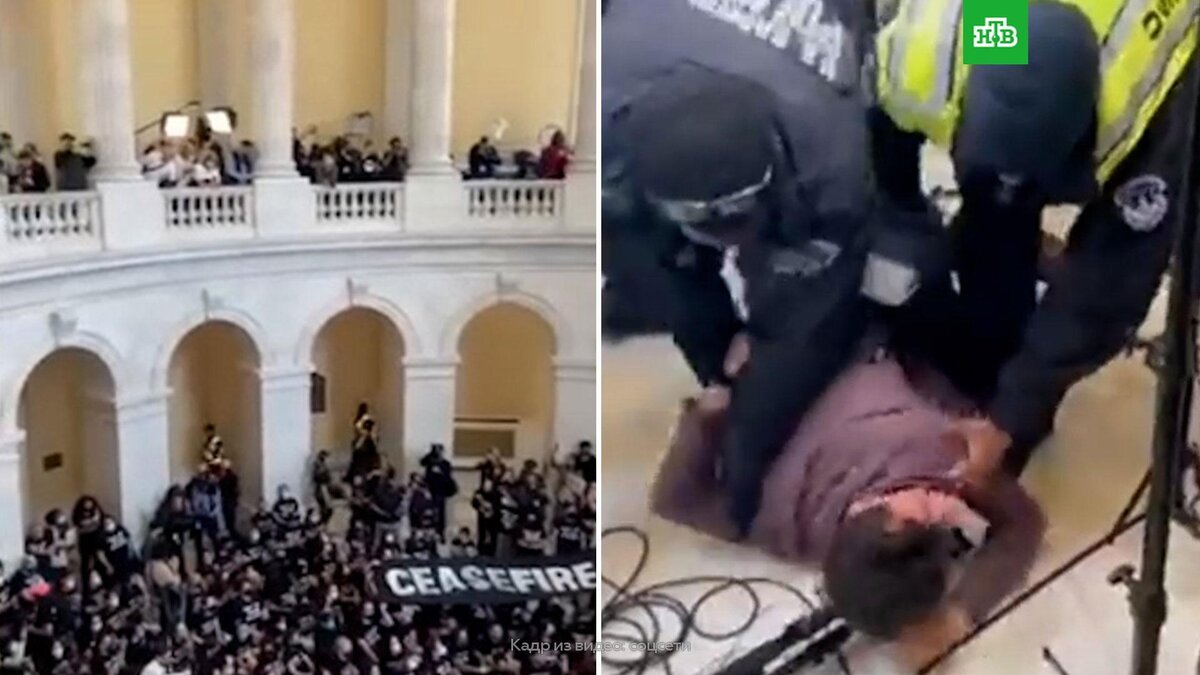 [ Смотреть видео на сайте НТВ ] В полиции Вашингтона сообщили, что в здании Конгресса США не осталось никого из проникших туда ранее манифестантов. Полиция выдворила из здания Конгресса США всех активистов, которые ранее прорвались туда и устроили свою акцию протеста прямо в центральной ротонде, под куполом знаменитого здания на Капитолийском холме. Сейчас полиция продолжает оформление арестованных еврейских активистов. Журналисты сообщают, что были задержаны не менее сотни человек, требовавших прекращения огня в зоне палестино-израильского конфликта. Они также требовали остановить поставки военной помощи США Израилю. Ранее сообщалось, что манифестацию против массированных обстрелов сектора Газа и обострения палестино-израильского конфликта собрала на Капитолийском холме организация Jewish voice for peace (Еврейский голос за мир). Митингующие должны были протестовать у стен американского парламента, но преодолели заграждения и заняли центральную ротонду Капитолия. Акция протеста была с