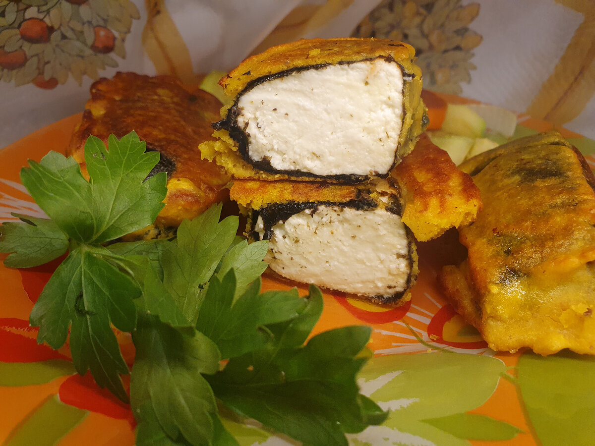 Эти штучки мы попробовали в московском кафе индийской направленности "Джаганнат". К блюду прилагался список ингредиентов, из которых я вывела рецепт. Как обычно попутно добавила кое-что от себя - без этого мне неинтересно. Ингредиенты: сыр адыгейский 300г, нори 6листов, рисовая мука, молоко 150мл, яйца 1шт, специи: имбирь, пажитник, кориандр, куркума, паприка бальзамический соус 1ч.л, растительное масло 1ст.л, лимонный сок 1ст.л В оригинале используется молодой сыр панир, но наш вездесущий адыгейский прекрасно его заменяет. Сыр режем на длинные брусочки, у меня вышло 6 штук. В миске соединяем лимонный сок, бальзамический соус, растительное масло, имбирь, паприку. Маринуем в полученной смеси сыр. Я сначала искупала все кусочки поочередно, затем промазала кистью места, не покрытые маринадом. Оставляем в холодильнике мариноваться на пару часов, можно и дольше. Приготовим кляр из муки (в идеале нутовой, но я обошлась рисовой), молока или воды, яйца и оставшихся специй. Лучше сначал