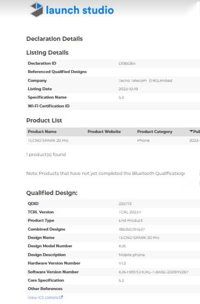 TECNO Spark 20 Pro замечен на сайте сертификации Bluetooth SIG