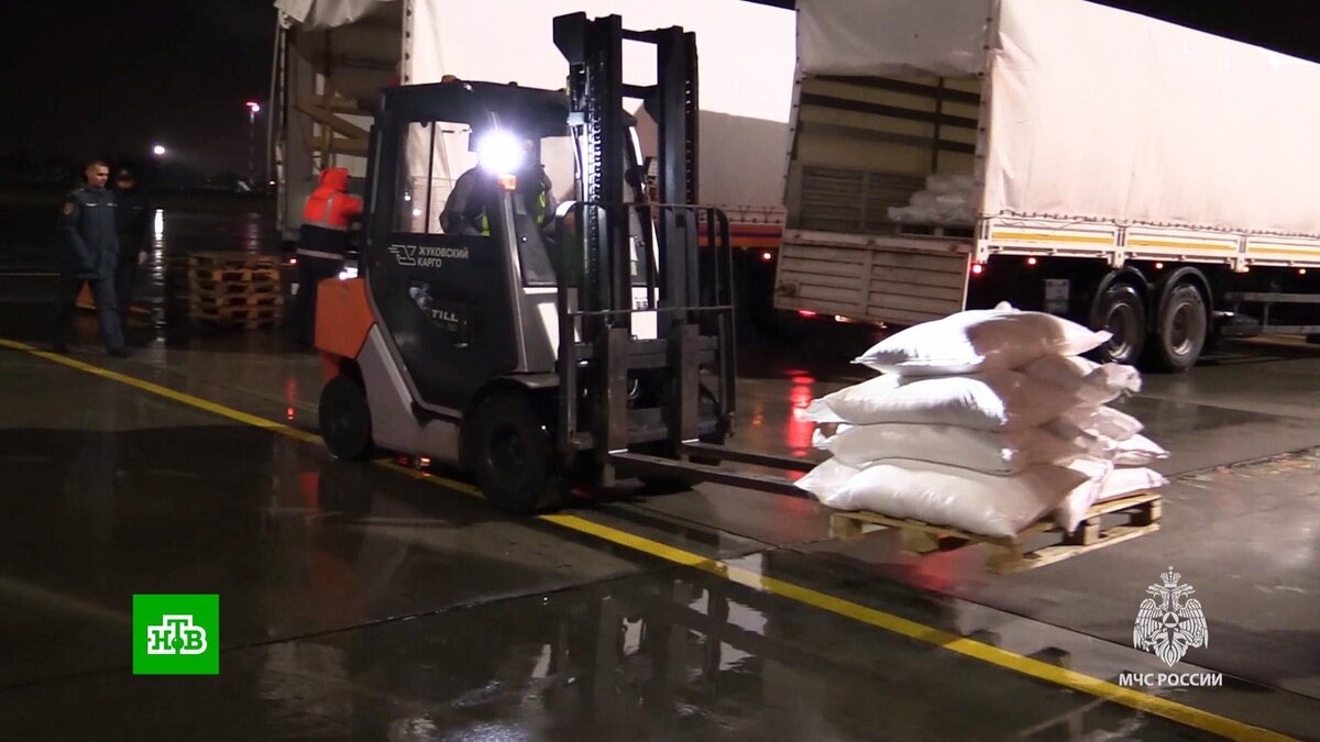 [ Смотреть видео на сайте НТВ ] Из подмосковного аэропорта вылетел спецборт МЧС с гуманитарной помощью для населения сектора Газа. Об этом сообщили в пресс-службе ведомства. Как сообщили в МЧС России, спецборт Ил-76 вылетел из подмосковного аэродрома Раменское в аэропорт города Эль-Ариш в Египте. «Российская гуманитарная помощь будет передана представителям Египетского общества Красного Полумесяца для отправки в сектор Газа», — говорится в сообщении. Населению доставят муку, сахар, рис и макаронные изделия. Общий вес — 27 тонн. В ведомстве подчеркнули, что помощь организована по указанию президента РФ Владимира Путина и поручению правительства. Утром 7 октября Израиль подвергся ракетной атаке палестинского движения ХАМАС из сектора Газа. Кроме того, после бойцы организации проникли в приграничные районы на юге Израиля. В ответ армия обороны страны начала операцию «Железные мечи» против ХАМАС. Тысячи израильтян и палестинцев погибли и были ранены. [ Смотреть видео на сайте НТВ ]