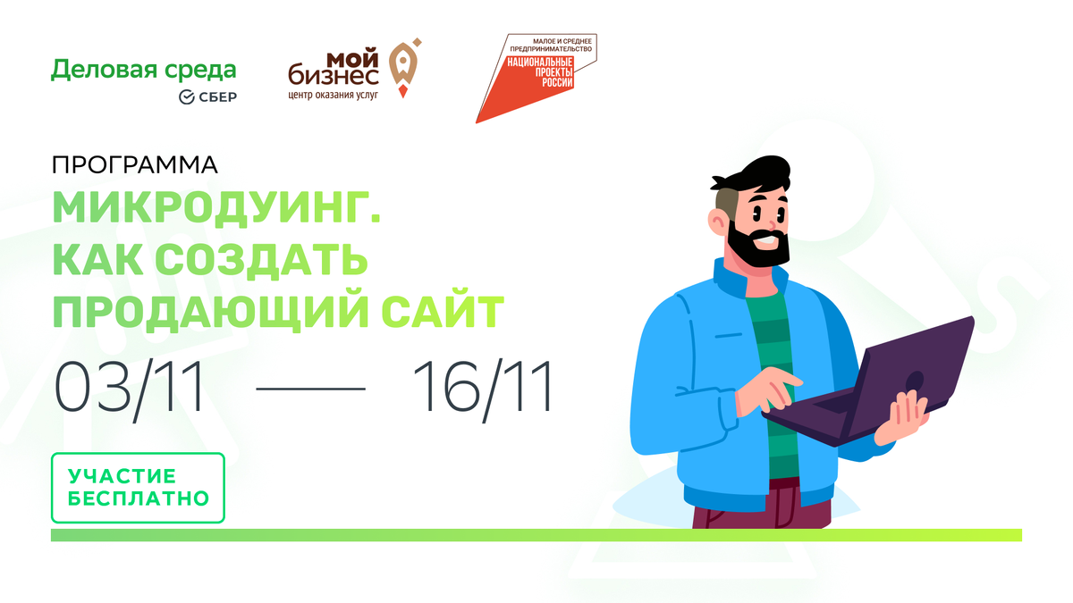 Представить современный бизнес-проект без сайта сейчас невозможно. Сайт может выполнять информационную функцию, быть визиткой проекта или основным каналом лидогенерации. Центр поддержки предпринимательства “Мой бизнес” Хабаровского края приглашает предпринимателей региона пройти образовательную онлайн-программу «Микродуинг. Как создать продающий сайт». В результате обучения участники смогут внедрить в сайт компании различные продающие механики: сильные офферы, всплывающие окна со спецпредложениями, каталоги товаров, возможность поместить заказ в корзину и оплатить его. Познакомиться с базовыми понятиями, такими как лиды, конверсия, лид-магнит, трипваер, тропинка возврата и т.д. получить комплекс базовых знаний по стратегическому маркетингу (анализ конкурентов, разработка персона-моделей) С 3 по 16 ноября 2023 года участники смогут в режиме онлайн поработать со спикерами-практиками и сразу начать применять инструменты в свои бизнесы. Основываясь на личном опыте и знаниях спикеры раскрою