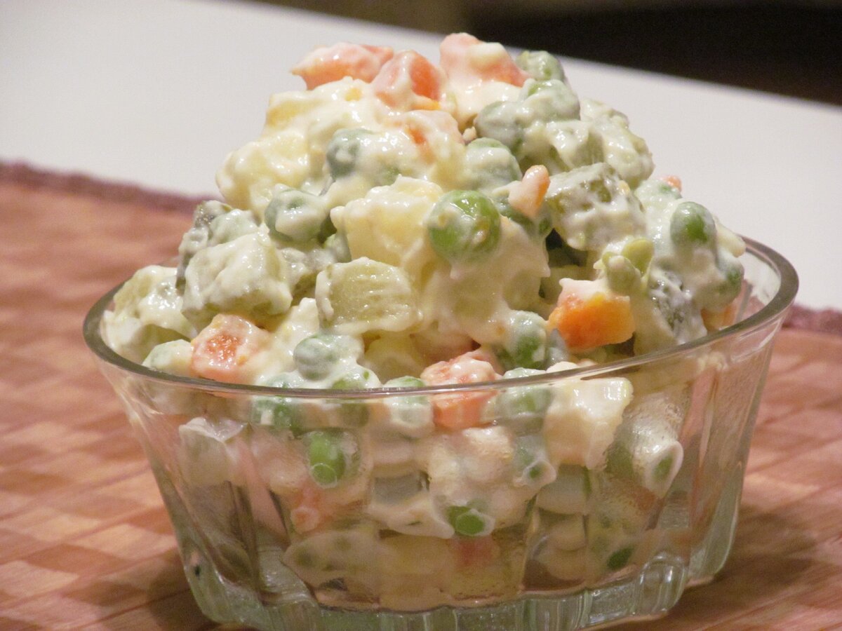 Здравствуйте дорогие гости моего канала. Вы на канале советская кухня. Надеюсь что мой новый канал порадуют вас очень вкусными возможно давно забытыми или в наше время уже измененными блюдами. Друзья скоро новый год осталось совсем немножко времени до боя курантов и сегодня я решил первый рецепт посвятить именно этому замечательному празднику . Сегодня я приготовлю очень вкусный салат зимний. Сейчас мы его с вами называем оливье но раньше в советские времена мы называли этот салат зимний. Для такого салата мне потребуется мясо отварное - желательно говядину, вареное яйцо, морковь, картофель и маринованные огурцы. Огурцы можно заменить солеными, обязательно лук репчатый. Зеленый горошек обязательно должен присутствовать в этом салате. И конечно же заправлять салат мы с вами будем майонезом провансаль. Раньше он у нас был стеклянных баночках но сейчас он продается и в мягких упаковках и в ведерках. Так что купите обязательно для такого салата именно майонез провансаль у него очень