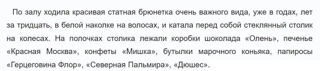 Помните, как назойливая официантка Марианна пыталась втюхать Володе Шарапову хоть какой-нибудь товар со своей тележки? В фильме "Место встречи изменить нельзя" мы видим на стеклянном столике три бутылки спиртного, яблоки, коробку печенья (видимо, птифур) и какие-то конфеты. А еще сигареты. Вот на них хотелось бы остановиться поподробнее. В тексте Вайнеров конкретно указано, чем именно торговала противная официантка. А вот что из этого набора Марианна на свою беду попыталась впарить Володе. Однако, в фильме Говорухина официантка сказала иначе. Вместо слова "папиросы" она произнесла "сигареты". Почему сигареты? Зачем было исправлять текст Вайнеров? Я знаю, что Говорухин многое переписал при разработке сценария, но все это были, так сказать, смысловые вещи. А с какой целью менять такое безобидное и ничего не значащее слово? Все дело в том, что в лотке у Марианны по роману лежали папиросы "Герцеговина Флор". У них очень яркая, запоминающаяся коробка, которую ни с чем не спутать. Эта марка