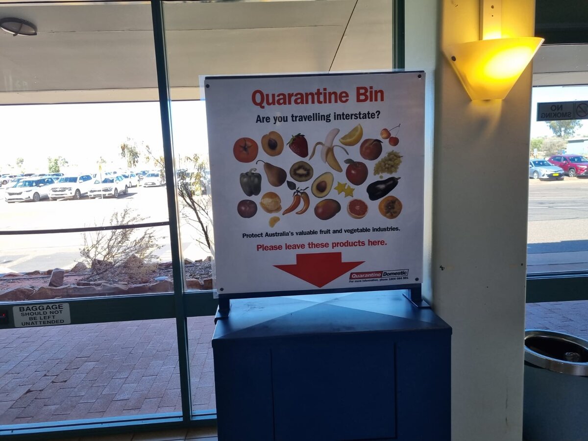Мы выходим в аэропорту Айерс Рок и нас никто не досматривает. Ох, зря мы съели мандарины, их бы не отобрали, хотя на выходе из аэропорта стоит ящик и на нем нарисованы все известные нам фрукты - яблоки, апельсины, виноград, бананы и т.д.