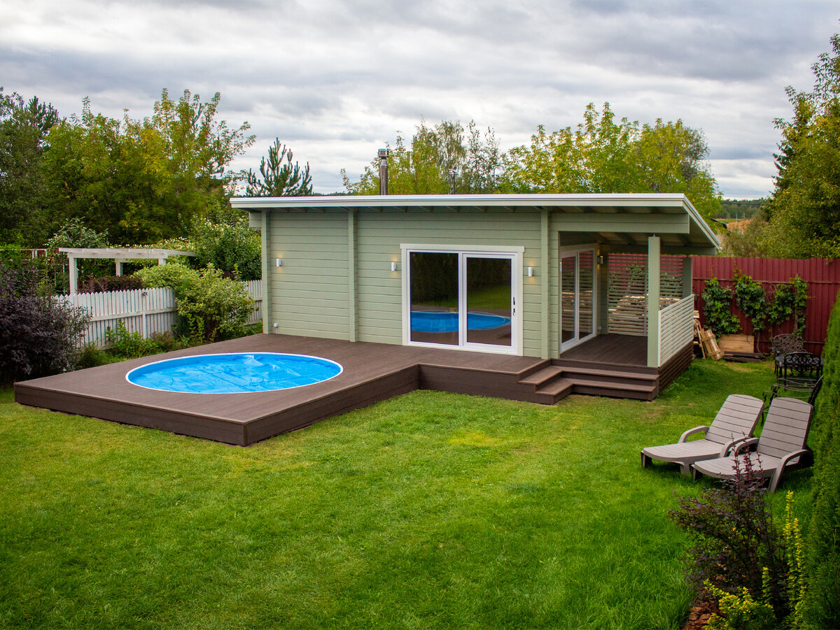 Обзор бани 9,6х3,9 м с бассейном на террасе