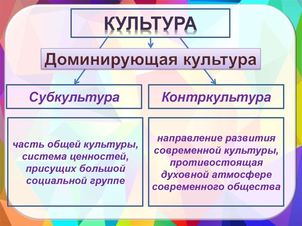 Субкультура — часть общей культуры, система ценностей определенной группы (молодёжная культура, профессиональная, этническая и пр.). «Господствующая культура определяет магистральное развитие, а субкультура отражает своеобразие образа жизни, символов и ценностей, мировосприятия, стандартов поведения конкретных социальных групп» (из учебника Котовой, Лисковой).Чаще всего в любой субкультуре реализуется потребность ее приверженцев в самовыражении(субкультура тинэйджеров). Субкультура — это не отрицание культуры, принятой большинством, а некоторое отклонение от нее (субкультура тинэйджеров выделилась из субкультуры детства). Отличие субкультуры от доминирующей культуры: собственная система ценностей, особый язык, одежда, манеры, особенности восприятия мира и его художественного отражения.