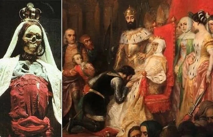 По его приказу тело Инес было извлечено из гроба, одето в королевское платье и посажено на трон. (К слову сказать, с момента ее смерти к тому моменту прошло уже 2 года).