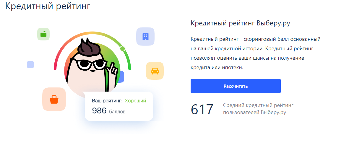 Новый продукт позволит клиенту узнать свой кредитный рейтинг, не обращаясь в бюро кредитных историй, и получить рекомендации по его улучшению. Финансовый маркетплейс “Выберу.ру” запустил новый сервис — “Кредитный рейтинг”. Продукт позволяет оценить шансы человека на получение потребительского кредита или ипотеки, а также предоставляет персональные рекомендации — выполняя конкретные действия, клиент сможет улучшить свою кредитную историю. Кроме того, сервис посоветует клиенту подходящие продукты. Услуга окажется полезной для тех, у кого уже есть кредитные обязательства, и для тех, кто ни разу не брал заемные средства, но хочет это сделать в будущем на выгодных для себя условиях. Также сервис поможет улучшить кредитный рейтинг тем, кто раньше сталкивался с частыми отказами банков. Для клиентов доступно три тарифа. Тариф “Кредитный балл” — бесплатный, с его помощью можно узнать скоринговый балл и получить общие рекомендации по его повышению. Режим “Кредитная консультация” подразумевает