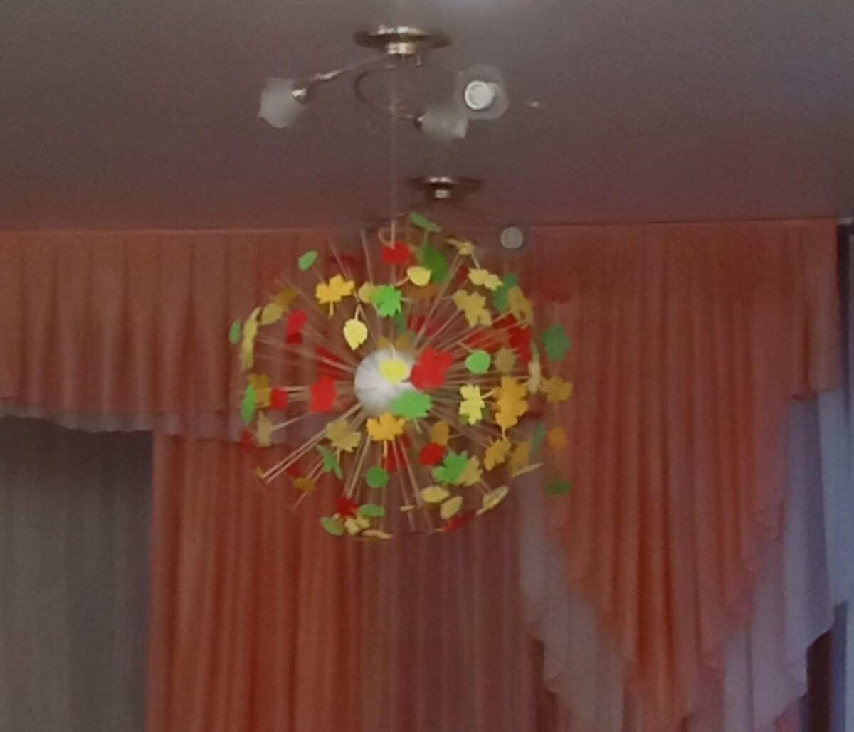 Уже который день, проводя музыкальные занятия, я любуюсь на новенький осенний шарик. На днях подвесили мы его к люстре в музыкальном зале, чтобы посмотреть, как будет выглядеть. Ребятки поют, танцуют, а я нет-нет да посмотрю на него, как он потихонечку кружится сам собой. Нежный, воздушный, красота неописуемая!