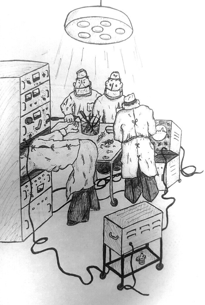 Из ершей мы сварили вкусную уху и тут же ее съели. Ухи и след простыл, а рука все еще опухшая. Саша Гурьев попросил помочь с ремонтом ЗАСовской системы шифрования телефонных переговоров. Там была фигня. Просто сдох выключатель питания на одном из блоков. А блоки, как металлические чемоданы лежат на металлических стойках и соединены между собой разъемами и кабелями. И вот, когда мы соединяли блоки друг с другом, валяющимися на полу кабелями, я допустил ошибку. Просто взял с пола не тот кабель. На вид они одинаковые, присоединительные фишки одинаковые. Особо ничем они не отличались. Только один просто передавал сигналы от одного блока к другому. А другой был кабелем питания и был воткнут в розетку хрен знает где за приборами. Я только попытался его подсоединить к блоку, как у меня в руке загорелась "сверх новая звезда" дикой яркости. Обычная свеча Яблочкова (и даже тут меня любимая физика нашла). Два толстых металлических контакта разделенных пластмассовым изолятором. Я их замкнул между собой и загорелась дуга. А я просто стою и тупо смотрю на то как капает расплавленный металл на пол. Нет бы бросить кабель на пол, так нет. Я стою и рассчитываю, а на сколько минут такого горения хватит длины контактов и изолятора? Мои расчеты прервал Сашка. Он выключил провод из розетки. В секретной комнате стало темно и не интересно. Я добавил нам двоим еще на час работы. Пошли посмотреть, не сгорели ли предохранители в распределительном электрощите. Не сгорели. Гвоздь 150-й как предохранитель довольно хорош. Заменили две фишки, укоротили кабель. Отмыли черное пятно на одном из блоков. Но все равно темная линия на блоке показывала траекторию движения моей руки, когда загорелась дуга. Рука тоже пострадала. Мало того что опухшая, так еще и обжег не слабо. Оставил Сашку на БРСе, он сегодня дежурный, а сам пошел в кубрик зализывать раны.