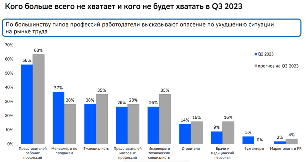 Но эта тактика дает сбой с учетом ситуации на рынке труда, которую мы имеем на сегодняшний день. Демографическая яма, дефицит рабочей сил из стран СНГ, выход в рынок и обеление тех работодателей, кто раньше работал по «серым» схемам, развитие интернет доставки - легкое переключение между профессиями курьера, сборщика и работника торгового зала в разных вариантах, запрос на рабочую силу в стройке и на заводах. Так, по данным Ассоциации Торгового маркетинга, нехватка персонала в рабочих профессиях достигает 63%*, представители массовых профессий - 28%.