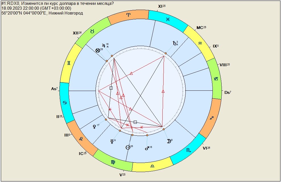 Мужчина имеет значительную сумму в рублях и желает её сохранить. Радикальность: Карта радикальна. Рассматриваем. Герои: Разбор: Сигнификатор Кверента в Падении (Луна в Скорпионе), стало быть Кверенту стоит запрет на использование его силы. При этом силы дает ему Трин с Асцендентом (восходящий градус), что обещает ему удачу в дальнейшем, что Кверент может рассчитывать на свои силы - его сила в нем самом. У Кверента есть Трин с Меркурием, управителем 5 дома, где находится сам кверент. При этом Кверент радикально не находится в теме 5 дома (творчество, радость, дети и подобное), но производно 5 дом это 2 дом от 4 дома. Кверент получает деньги от аренды своей недвижимости. При этом Луна сигнификатор не только Кверента, но и кошелька Кверента. Сатурн в ретроградном движении - сильное эссенциальное повреждение. Иначе говоря, доллар мог мы себя чувствовать и лучше, но не сейчас. В директное движение он перейдет в начале ноября так и не перейдя в знак Водолея. Сатурн делает Трин к Кверенту,