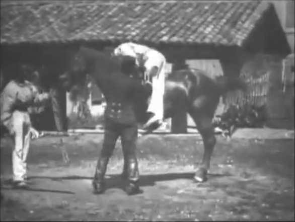 Трое мужчин и лошадь стоят в поле. Первый человек в белом держит поводья лошади, второй мужчина в черном стоит и наблюдает, а третий пытается сесть на лошадь. После шести неудачных попыток он наконец смог сесть и готов ехать в боковом седле . Луи Люмьер, снимая очередную свою короткометражку, на этот раз не просто целился на грядущее умиление и восхищение зрителей, но также попытался их рассмешить.