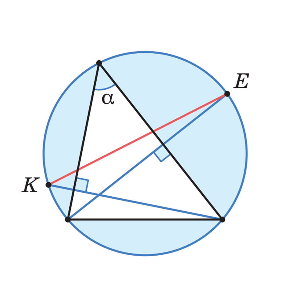 Задача: В окружность радиуса R вписан треугольник с углом α. Продолжения двух его высот, опущенных из двух других его углов, пересекают эту окружность в точках K и E. Найдите длину отрезка KE. ©Математическая Вертикаль. Учебное пособие для общеобразовательных организаций. Автор: М.А.Волчкевич. Решение: Рассмотрим четырёхугольник LBNM: ∠LMN = 360° - 90° - 90° - α = 180° - α. ∠EMC = 180° - ∠KMN = α, так как ∠EMC и ∠KME - смежные (см рисунок) Провёдем хорду EC. ∠AEC и ∠ABC опираются на дугу ◡AC ⇒ ∠AEC = ∠ABC = α. Рассмотрим △MCE: ∠MCE = 180° - 2α. По теореме синусов для хорд KE = 2R * sin∠MCE = 2R * sin(180° - 2α) = 2R * sin(2α) = 4R * sin α * cos α. Ответ: 4R * sin α * cos α. Задача решена.