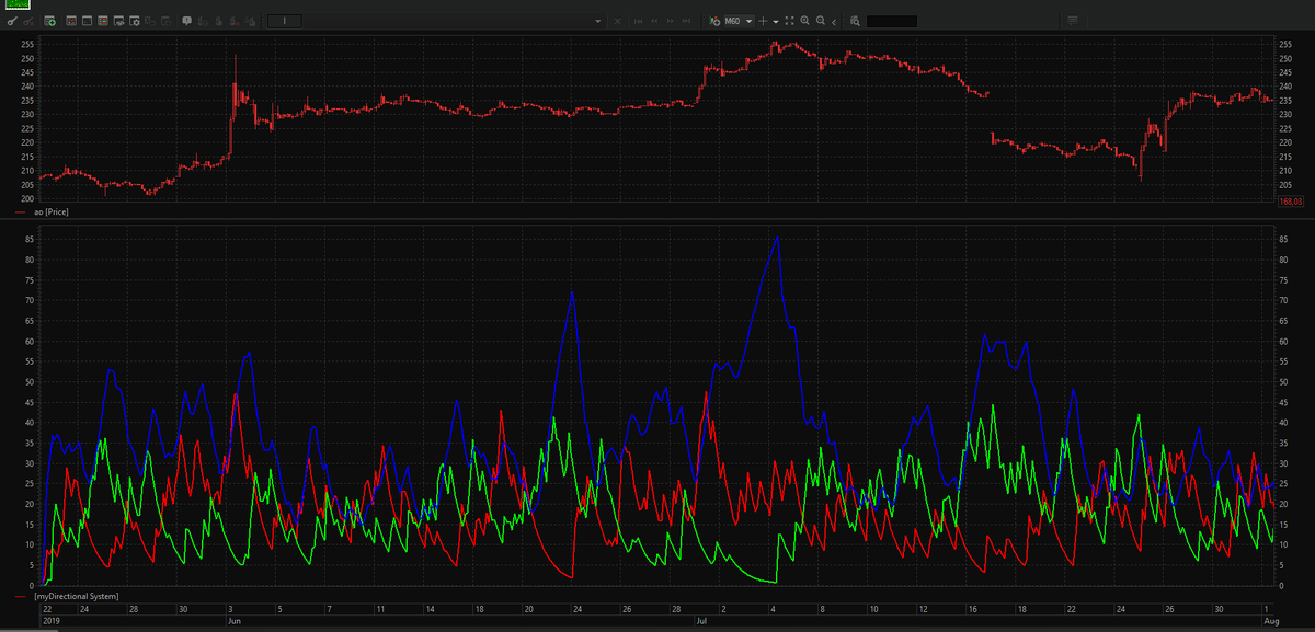 Система направлений представляет собой три взаимно пересекающиеся линии, каждая из которых показывает числовое значение динамики тренда в диапазоне от 0 до 100. Две линии обозначают силу быков и медведей (+DI, -DI), а третья, измеряет доминирование одной группы над противоположной, через экспоненциальное сглаживание (ADX).