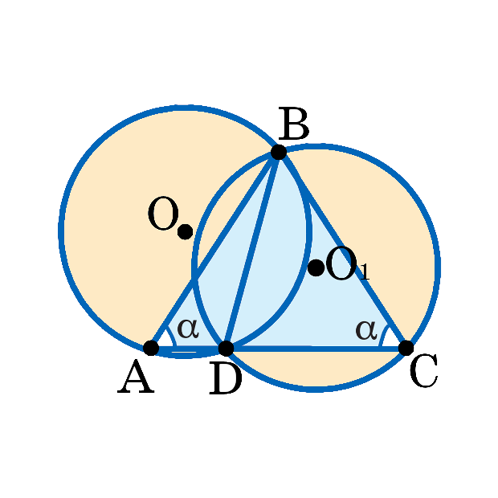 Задача: Отрезок соединяет вершину равнобедренного треугольника с произвольной точкой на его основании и разбивает данный треугольник на два треугольника. Докажите, что радиусы окружностей, описанных около двух этих треугольников, равны. ©Математическая Вертикаль. Учебное пособие для общеобразовательных организаций. Автор: М.А.Волчкевич. Решение: Построим равнобедренный треугольник ABC с острым углом α, опустим чевиану BD на основание AC и опишем окружности с центрами O и O1 вокруг полученных треугольников ABD и CBD соответственно (см рисунок). BD - общая хорда полученных окружностей. В △ABD: по теореме синусов для хорд sin α = BD/2r, отсюда радиус окружности с центром O: r = sin α * BD/2. В △CBD: по той же теореме синусов для хорд sin α = BD/2r , отсюда радиус окружности с центром O1: r1 = sin α * BD/2. Итак, r = r1. Что и требовалось доказать. Задача решена.