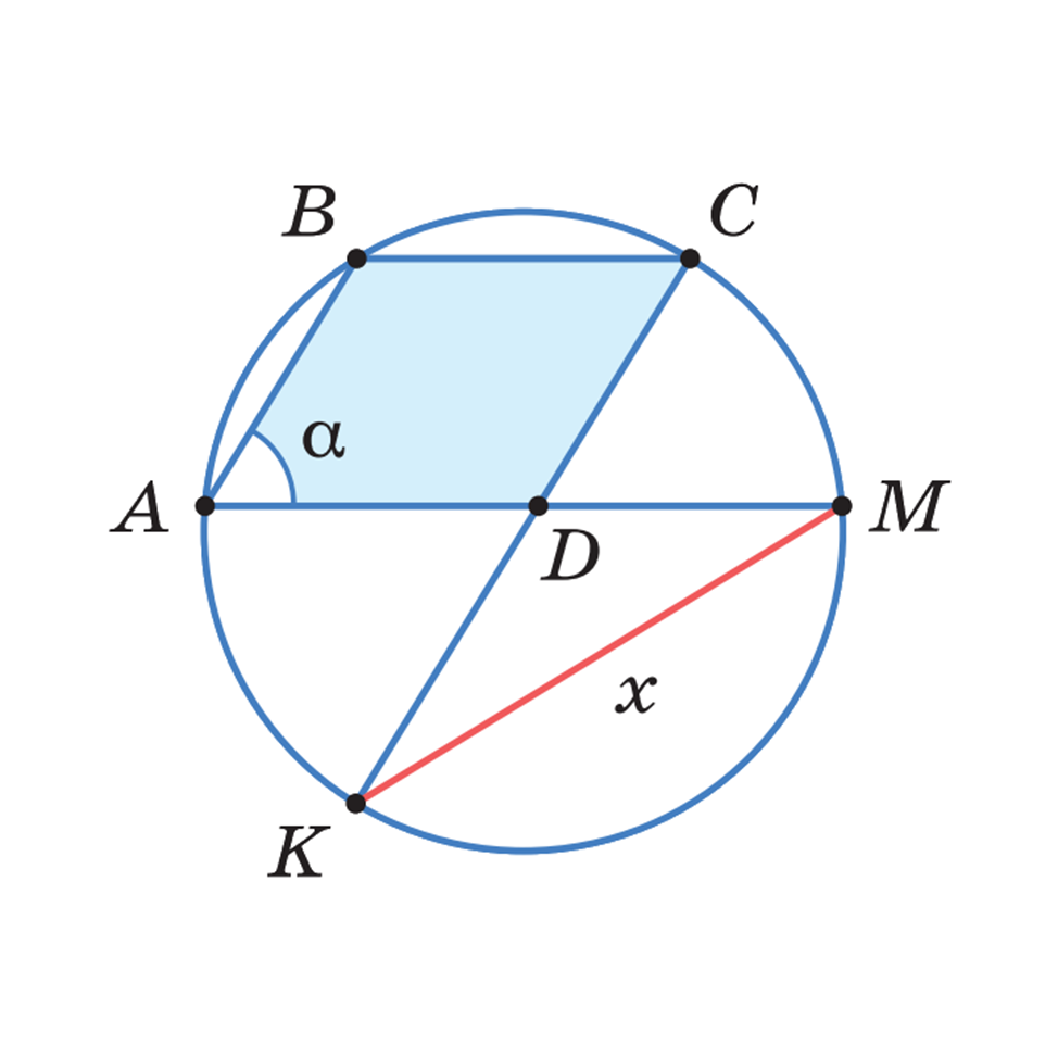 Задача: Окружность радиуса R проходит через вершины A, B и C параллелограмма ABCD и второй раз пересекает прямые AD и CD в точках M и K. Найдите длину отрезка MK, если острый угол параллелограмма равен α ©Математическая Вертикаль. Учебное пособие для общеобразовательных организаций. Автор: М.А.Волчкевич. Решение: В параллелограмме ABCD: ∠ABC = 180° - α. Проведём хорду AK. Рассмотрим вписанный четырёхугольник KABC: поскольку четырёхугольник вписанный, то сумма противоположных углов 180° ⇒ ∠AKC + ∠ABC = 180°; ∠AKC = 180° - (180°- α) = α. ∠BAD = ∠ADK = α, как накрест лежащие при пересечении AB∥KC и секущей AD. В △KAD: ∠KAD = 180° - 2α. По теореме синусов для хорд: KM/2R = sin(180° - 2α); KM = 2R * sin(180° - 2α) KM = 2R * sin 2α KM = 4R * sin α * cos α. Ответ: 4R * sin α * cos α. Задача решена.