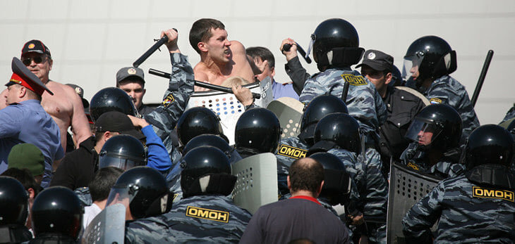 Раз в несколько лет омоновцы дрались с футбольными фанатами. Вот несколько классических примеров.