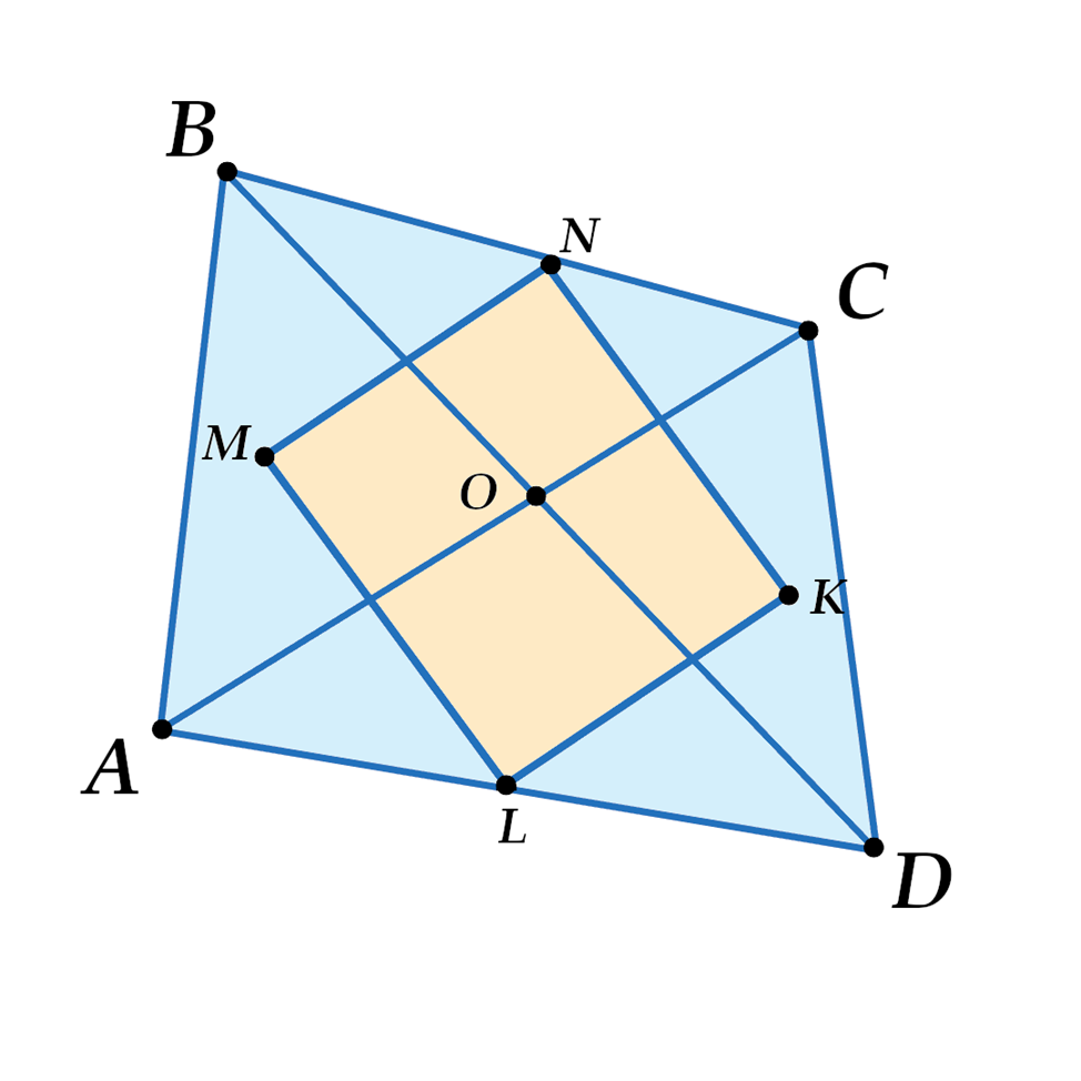 ©Математическая Вертикаль. Учебное пособие для общеобразовательных организаций. Автор: М.А.Волчкевич. Решение: Центр описанной около треугольника окружности лежит на пересечении серединных перпендикуляров его сторон ⇒ OC1 = CC1, BB1 = OB1, AA1 = OA1, OD1 = DD1. Проведём OK, KC, KD; AM, OM, BM. Поскольку точки K и M - точки описанных окружностей, то OK = KC = KD и AM = OM = BM (см. рисунок). Если, OK = KC, то △OKC - равнобедренный по определению, а KC1 - его медиана ⇒ по св-у р/б треугольника KC1 является его биссектрисой и высотой ⇒ AC⟂KN. Так же доказываются BD⟂KN, AC⟂ML и BD⟂MN. AC⟂KN и AC⟂ML ⇒ KN ∥ ML; BD⟂KN и BD⟂MN ⇒ KN ∥ MN. Тогда четырёхугольник MNKL - параллелограмм по определению. Воспользуемся той же схемой вывода площади, ка