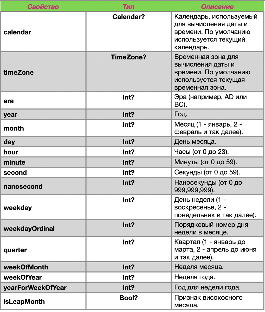 Каждое свойство является опциональным (Int?, Bool?, и так далее), что означает, что вы можете либо установить его значение, либо оставить nil, если это свойство не используется в вашем контексте. Создание DateComponents и формирование даты Разбор даты на компоненты Добавление компонентов к текущей дате Эти примеры демонстрируют как создавать объекты DateComponents, извлекать компоненты из даты и добавлять компоненты к текущей дате в Swift. Углубитесь в тему, прочитав дополнительный материал. Раскройте больше аспектов этой увлекательной темы: Calendar in Swift Dates and Times in Swift DateFormatter in Swift