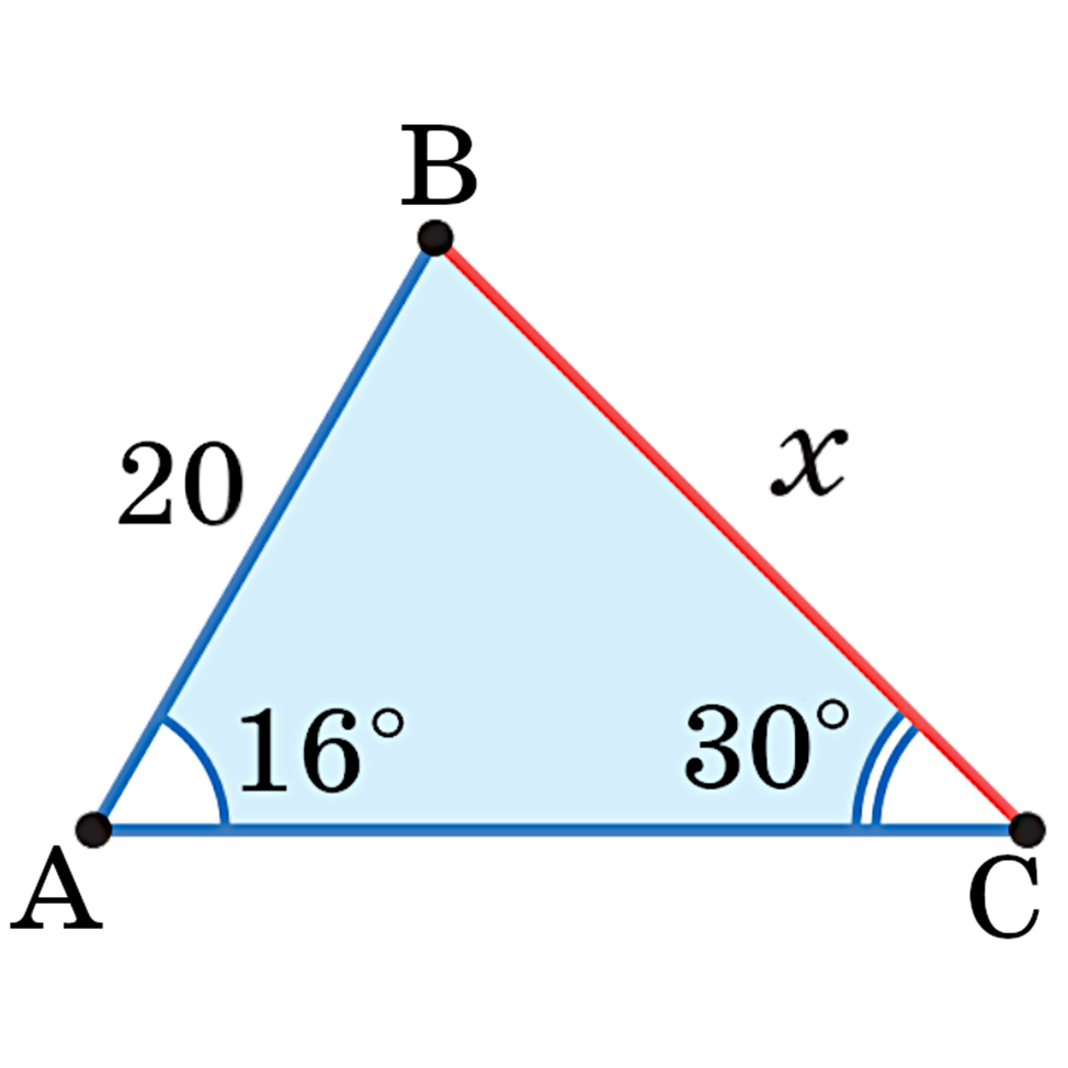 Задача: Два угла треугольника равны 16° и 30°. Сторона треугольника, лежащая против большего и этих углов, равна 20 см. Найдите его сторону, лежащую против меньшего из данных углов, с точностью до 1 мм. ©Математическая Вертикаль. Учебное пособие для общеобразовательных организаций. Автор: М.А.Волчкевич. Решение: По т. синусов sin 16°/x = sin 30°/20 ⇒ x = 20sin 16°/sin 30° = 40 sin 16°. По таблице значений sin 16° ≈ 0,275. x ≈ 40 * 0,275 = 11(см.) Ответ: 11 см. Задача решена.